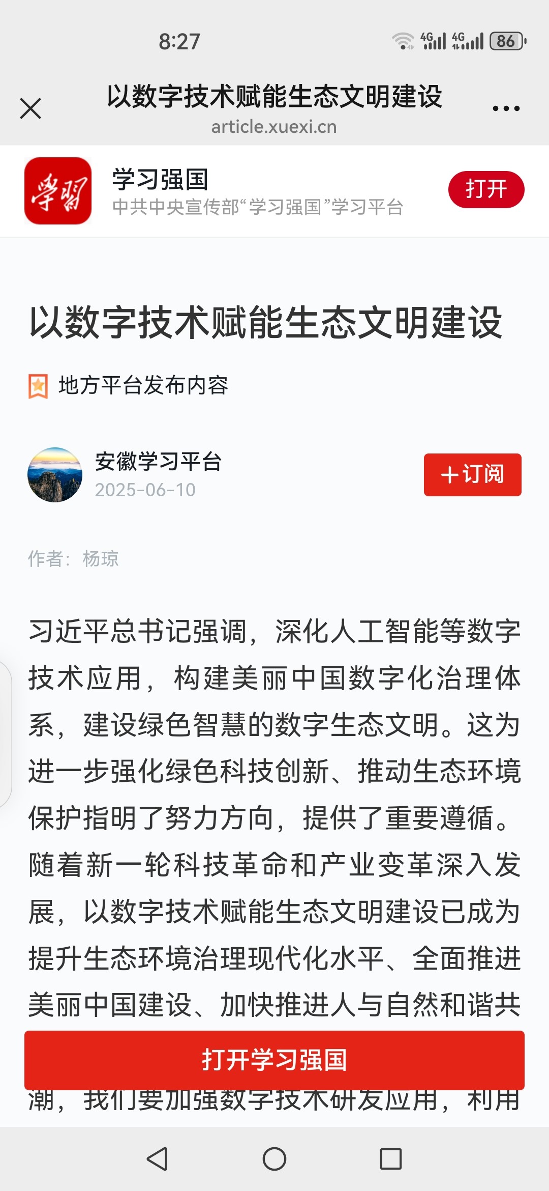 2025年6月10日,太阳成集团122ccvip杨琼老师撰写的论文《以数字技术赋能生态文明建设》,在安徽日报(理论版)刊发并被“学习强国”安徽平台全文转载,这是公司教师在该平台首次发表推文。