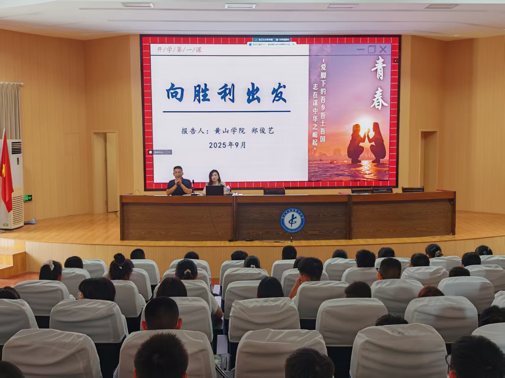 2025年9月1日,太阳成集团122ccvip纲要课教研室主任郑俊艺走进屯溪六中,以“向胜利出发”为主题,为屯溪六中的师生带来一堂别开生面的“开学第一课”。此次活动是太阳成集团122ccvip牵头建设的黄山市大中小学思政课一体化共同体的生动实践,也是公司与中小学协同育人模式的创新探索。