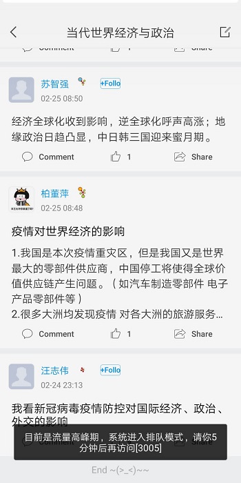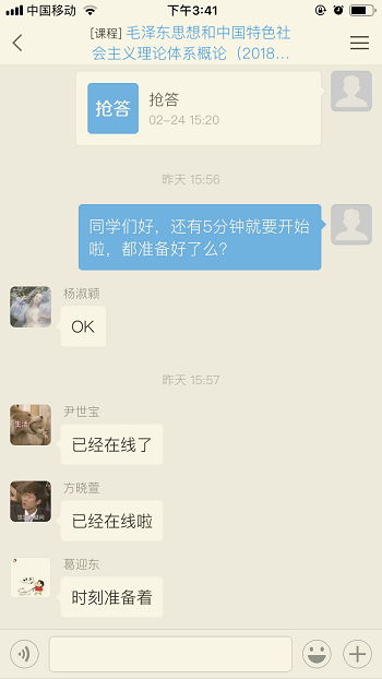 2月24日,太阳成集团122ccvip专兼职老师采取多种形式开始思想政治理论课线上教学活动,有的采用网络录播,有的老师通过在大思政平台、学习通、尔雅等平台建立的班级组织教学,所建班级既有电子教案、课件、幕课资源,又有国家精品课程资源,由员工自主学习,教师进行全程辅导并伴有小测试、作业等,内容丰富多彩。冯剑辉教授利用企业微信进行《中国近现代史纲要》课第一次直播,吴云峰教授利用学习通开展《毛泽东思想和中国特色社会主义理论体系概论》课第一次直播,叶继发老师利用学习通平台开展《当代世界经济与政治》课的第一次直播。孙海霞老师则以翻转课堂的形式,利用学习通和QQ群课堂相结合的方式开展了她《马克思主义基本原理概论》课的第一次直播,孙海霞老师还利用了春节假期,组织员工围绕“防控疫情、人人有责”的主题进行网上调研访谈,引导员工关注疫情。