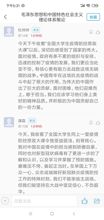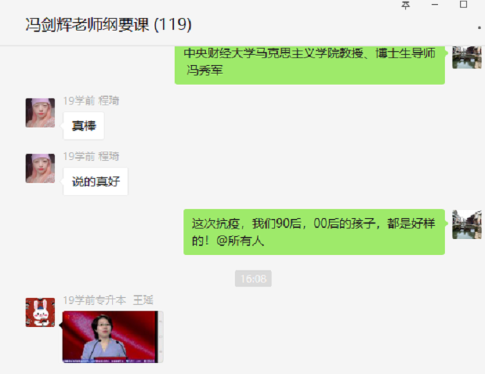 文公司2017级文化与产业管理付雯瑶:今天下午全国老员工同上一堂疫情防控思政大课,是我学习生涯中最特殊的一堂课程。这段时间每天打开手机第一个动作就是看疫情最新通报,一天中大部分时间也都在关注着疫情最新动态,急切期盼着拐点”早日到来,疫情尽快结束。 这段时间,冲破病毒阴霾不断传出的每个好消息:中国成功分离出新型冠状病毒毒株,武汉14家方舱医院中已有12家“关门大吉”,社会各界驰援武汉,防疫措施不断升级..这些好消息抚慰着每颗焦灼不安的心,让人们看到了病毒终将被战胜的希望。每一个好消息都不是凭空产生的,其背后,是不断提高的科研水平和医疗卫生水平,科研人员夜以继日的攻坚克难和医护人员的坚守担,是奋战在一线的各行业工作人员,他们依然在为城市的运转市民的生活提供方便,是每一个在疫情面前做好自己,用点点滴滴行动守好防线的你我。这些,都是浓浓的民族精神凝聚在一起的力量,让病毒恐惧的力量。