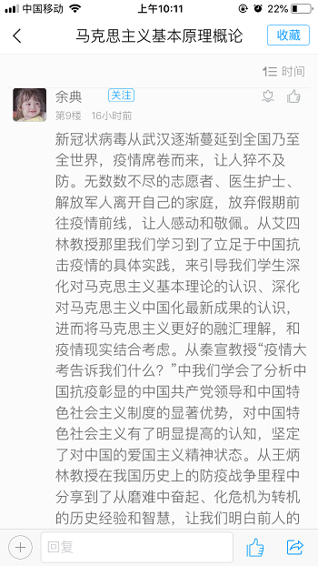 太阳成集团122ccvip教授冯剑辉老师:四位教授结合四门思政课教学内容,解读以习近平同志为核心的党中央关于疫情防控的决策部署,分析中国抗疫彰显的中国共产党领导和中国特色社会主义制度的显著优势,讲述防疫战疫一线的感人故事,让我们受到了一次深刻的防疫教育、国情教育、思政教育,切实增强四个自信。这次疫情,是对整个中国的一次大考,是对我国治理体系、防疫体系、医疗体系、经济体系……乃至于每一个公民的一次重大考验。由于疫情暴发迅猛,冲击强烈,影响范围之大,破坏之强,在中国乃至人类历史上,都是罕见的。现在,中国疫情已基本得到了有效控制,生产生活正在逐步恢复正常,但全球范围内疫情的还在不断发展,这场战斗也还远远没有结束。但在总结前期经验教训的基础上,我们非常有信心在以习近平同志为核心的党中央坚强领导下,一定能够取得防疫战争的全面胜利!一定能够实现我国经济社会发展的各项目标!中国特色社会主义的伟大事业,将在各种艰难险阻的考验下,乘风破浪,不断前进!