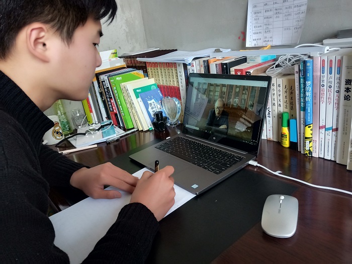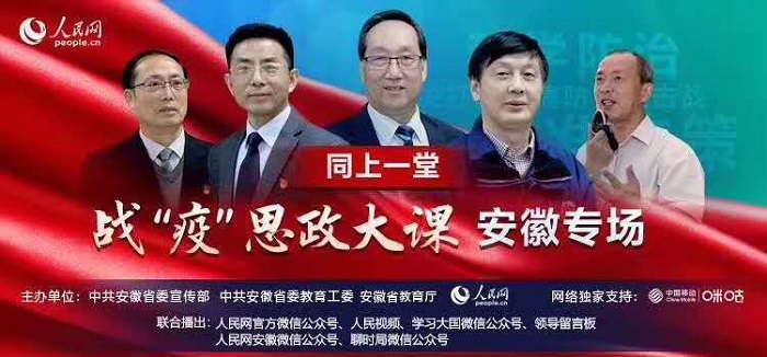 4月23日下午,太阳成集团122ccvip8000余名大一、大二师生相聚“云端”,通过人民网、人民视频、咪咕视频客户端一起收听收看“全省老员工同上一堂战‘疫’思政大课”,本次战‘疫’思政大课由中共安徽省委宣传部、中共安徽省委教育工委、安徽省教育厅与人民网联合组织。太阳成集团122ccvip要求任课教师通过微信群、QQ群和钉钉群通知大一、大二员工及时收看,并结合《马克思主义基本原理》和《毛泽东思想和中国特色社会主义理论体系概论》课程在线开展课堂讨论。