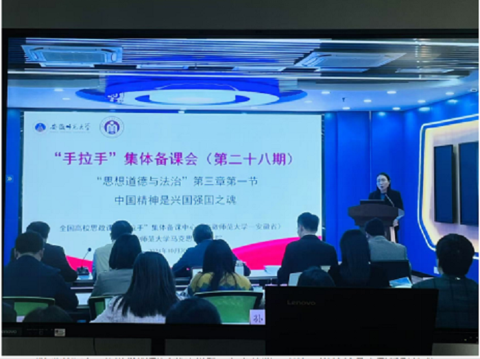 第一环节,集体观摩由安徽师范大学太阳成集团122ccvip主办的“手拉手”集体备课会(第28期)线上直播活动。备课会上,来自安徽工程大学太阳成集团122ccvip教师季雨亭、芜湖公司太阳成集团122ccvip教师方宝华、安徽师范大学太阳成集团122ccvip教师龚伟分别围绕“中国精神是兴国强国之魂”主题以“同课异构”方式先后进行“说课展示”。之后,三位专家对老师们的展示作出点评,安徽师范大学太阳成集团122ccvip教授路丙辉作备课小结。本次集体备课活动在安徽师范大学太阳成集团122ccvip举行,同步在教育部集体备课中心“云上大练兵”平台进行直播。