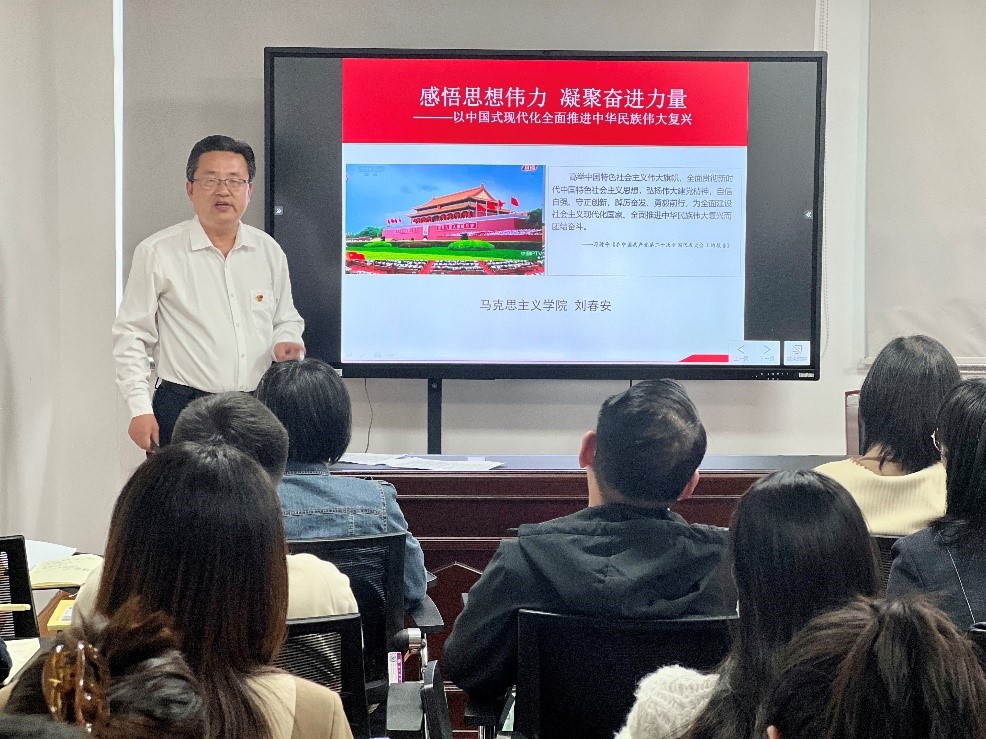 5月10日下午,太阳成集团122ccvip在该公司党员活动室开展学习贯彻习近平新时代中国特色社会主义思想主题教育专题党课。该公司党总支书记刘春安作题为“感悟思想伟力 凝聚奋进力量”党课报告。该院全体教师参加党课学习。